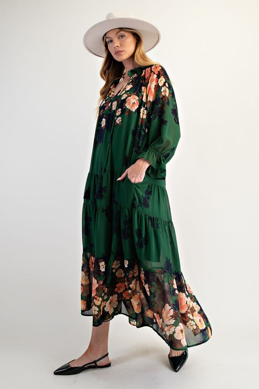 The Celeste Dress is pure romance in motion. Crafted from flowy chiffon with a soft border floral print, this forest-green maxi is designed for a relaxed yet elegant fit. The ruffled collar with tie neckline adds a feminine touch, while long sleeves and hidden side pockets make it effortlessly wearable. Fully lined for comfort, the tiered skirt moves gracefully with each step, making this the ultimate dress for conference nights and beyond.
