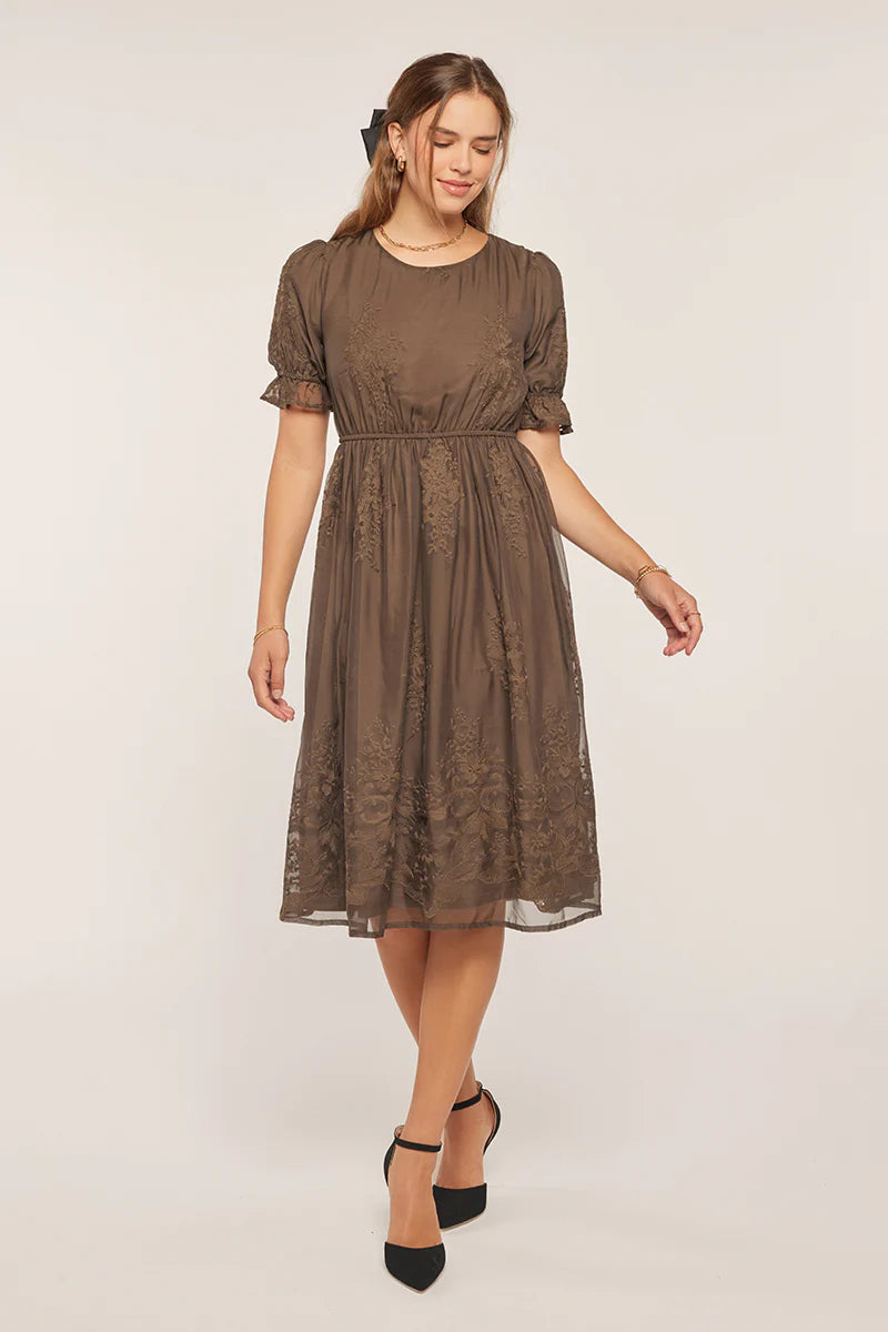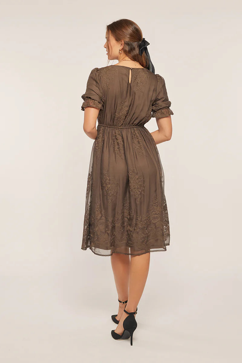 This dreamy embroidered midi carries the warm, earthy elegance that Madrid is known for, especially in the winter evenings when the city lights glow against historic stone streets.